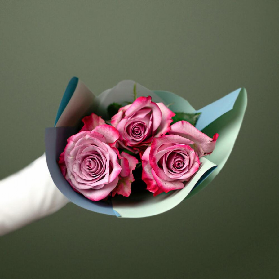 На фото букет из 3 фиолетовых роз. В составе: роза 3 шт, дизайнерская упаковка 1 шт, атласная лента 1 шт, . Все цветы свежие и ароматные, букет красиво оформлен и отлично подходит для подарка. Доступна доставка цветов или самовывоз.